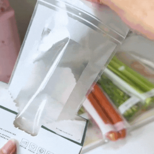 Long, herb-friendly, stand-up zip pouches that keep coriander, spring onions, beans & carrots crisp for days while keeping your fridge neat and spill-free.